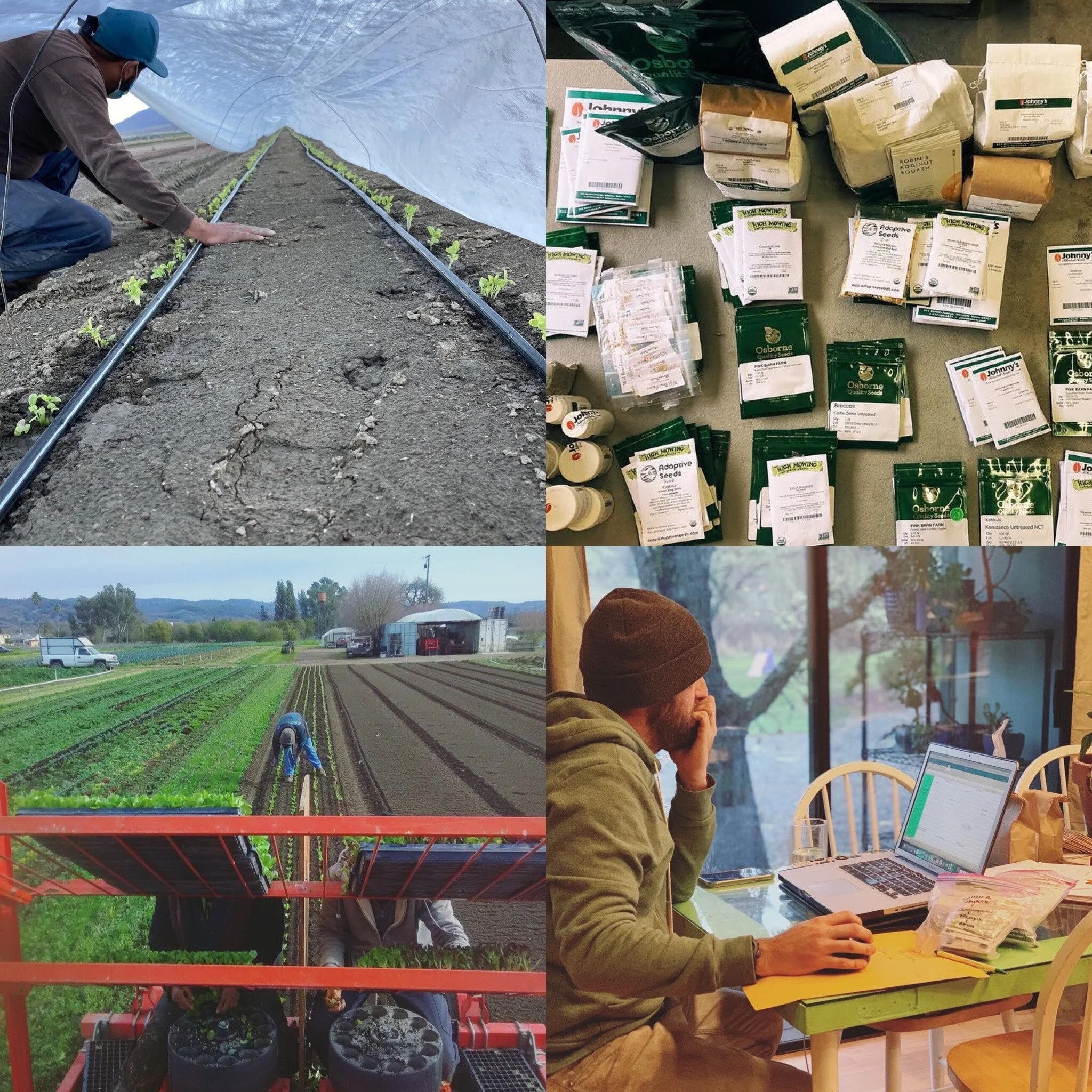 Winter operations on the farm, (from top left clockwise) featuring County Line Harvest experimenting with some winter basil starts in their covered beds, Pink Barn Farm with an elaborate seed spread preparing for the season ahead, the team at Paul's Produce seeding spring mix for our FEED Bins come March, and Andy of Confluence Farm trying to concentrate on strategizing and planning for the upcoming year while keeping their baby entertained. This time of year looks different for every farm, but largely consists of reflection, strategizing, planning, analyzing, purchasing large amounts of seeds, starting seeds, taking risks, and biting fingernails.