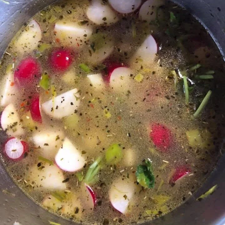Sauté the leek and celery root in olive oil, add a little sherry as it begins to stick, then water and Mediterranean herb mix. Separate and clean radishes and their greens, keeping an inch of head on each bulb. Cut bulbs into fourths. Add to stock and simmer until celery root gets very soft. Adjust seasonings as desired, add 1/2 tsp cumin. Add greens, bring to boil, then turn off heat. Add seasoned rice wine vinegar to taste.