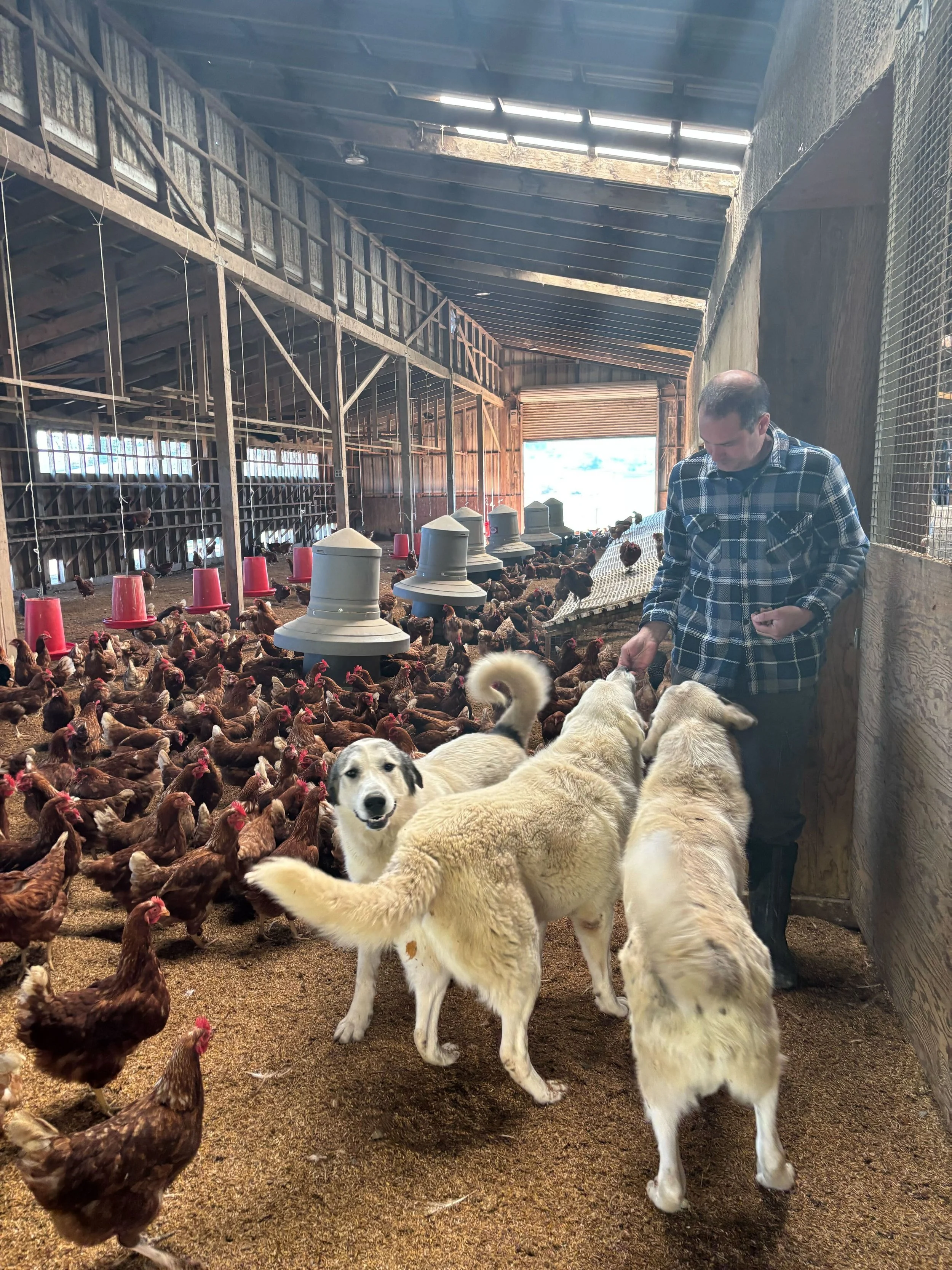The birds are mostly the Tetra Brown breed, but there's a smattering of unique breeds as well, shuffling around in rice hull bedding Bobby uses in the barn. The animals have ample water, food, and protection from a crew of sweet, big livestock guardian dogs. The birds’ enjoy fresh pumpkins (from his pumpkin patch) and dried flint corn, grown on the farm, as part of their diet.